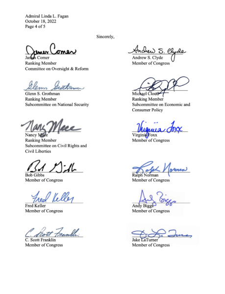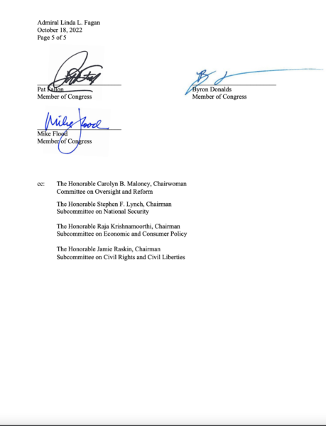 WASHINGTON, D.C. – Today, Congressman Byron Donalds (R-FL), House Committee on Oversight and Reform Ranking Member James Comer (R-Ky.), Representative Andrew Clyde (R-Ga.), and Oversight Committee Republicans sent a letter to Admiral Linda L. Fagan, Commandant of the U.S. Coast Guard (USCG), expressing serious concerns over USCG’s apparent failure to provide due process to members requesting religious exemptions to the COVID-19 vaccine mandate. Information received by Committee Republicans show the USCG denied nearly every applicant seeking a religious exemption from the vaccine mandate and the lawmakers are now requesting a staff-level briefing to understand the Coast Guard’s application review process which has deprived over 1,300 members of a fair adjudication of their exemption request.