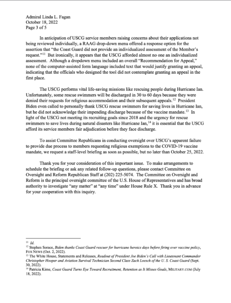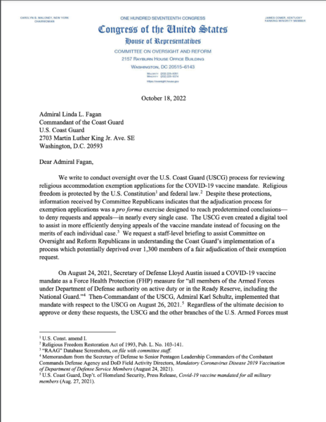 “Committee Republicans have learned that the USCG denied virtually all religious exemption requests and dismissed appeals en masse with the help of computer-assisted technology, indicating that no case-by-case determinations were taking place,” continued the Republican lawmakers. “Just as troubling, appeals of initial denials were denied with the assistance of a computer-generated form-filler tool called the ‘Religious Accommodations Appeal Generator,’ or RAAG. The USCG performs vital life-saving missions like rescuing people during Hurricane Ian. In light of the USCG not meeting its recruiting goals since 2018 and the urgency for rescue swimmers to save lives during natural disasters like Hurricane Ian, it is essential that the USCG afford its service members fair adjudication before they face discharge. To assist Committee Republicans in conducting oversight over USCG’s apparent failure to provide due process to members requesting religious exemptions to the COVID-19 vaccine mandate, we request a staff-level briefing as soon as possible.”