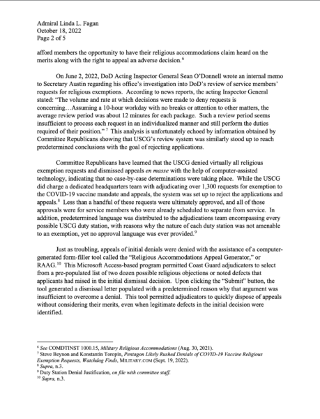 “Religious freedom is protected by the U.S. Constitution and federal law. Despite these protections, information received by Committee Republicans indicates that the adjudication process for exemption applications was a pro forma exercise designed to reach predetermined conclusions—to deny requests and appeals—in nearly every single case,” wrote the Republican lawmakers. “The USCG even created a digital tool to assist in more efficiently denying appeals of the vaccine mandate instead of focusing on the merits of each individual case. Regardless of the ultimate decision to approve or deny these requests, the USCG and the other branches of the U.S. Armed Forces must afford members the opportunity to have their religious accommodations claim heard on the merits along with the right to appeal an adverse decision.”